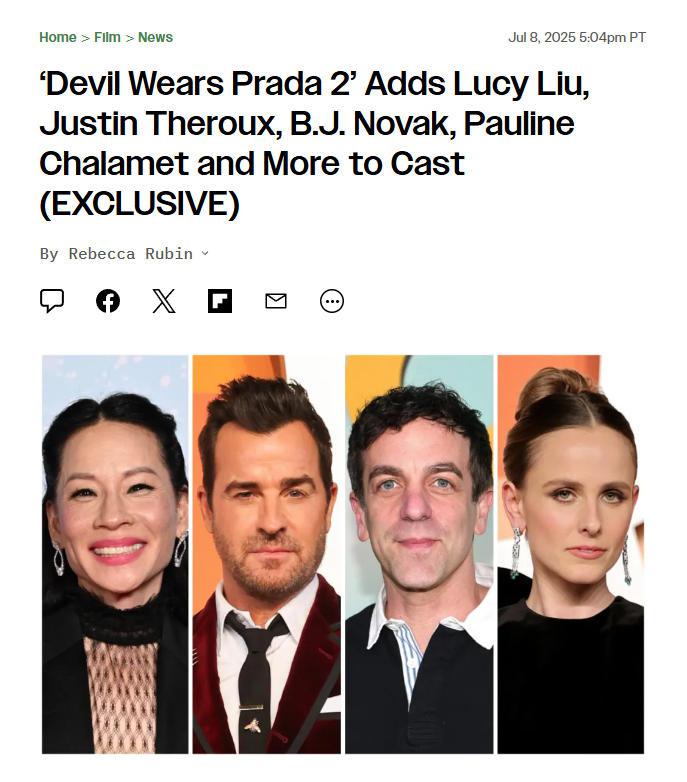 1905 电影网讯 据外媒报道,已于上周开拍的经典续作《穿普拉达的女王 2》(The Devil Wears Prada 2)追加多名新卡司,包括刘玉玲、西蒙娜 · 阿什利、贾斯汀 · 塞洛克斯、B · J · 诺瓦克、宝琳 · 查拉梅、Helen J. Shen、康拉德 · 里卡摩拉、凯莱布 · 希伦。